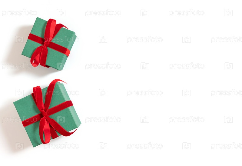 Две зеленые подарочные коробки с красными бантами, изолированные на белом фоне с местом для копирования. Вид сверху, плоская планировка. Рождественская или новогодняя открытка
