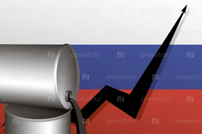 Нефть льется из жестяных бочек на фоне черной графики на флаге России