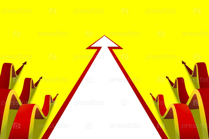 Шесть волнистых стрелок, ползущих вперед, простая белая стрелка на желтом фоне