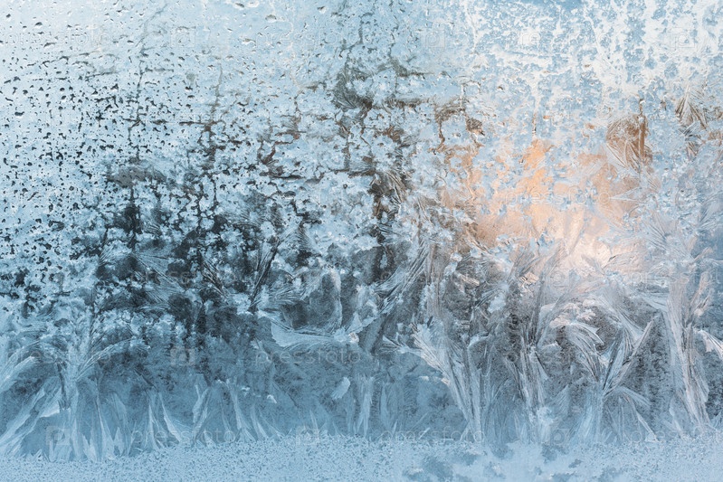 Зимний синий морозный фон. Замерзшее оконное стекло