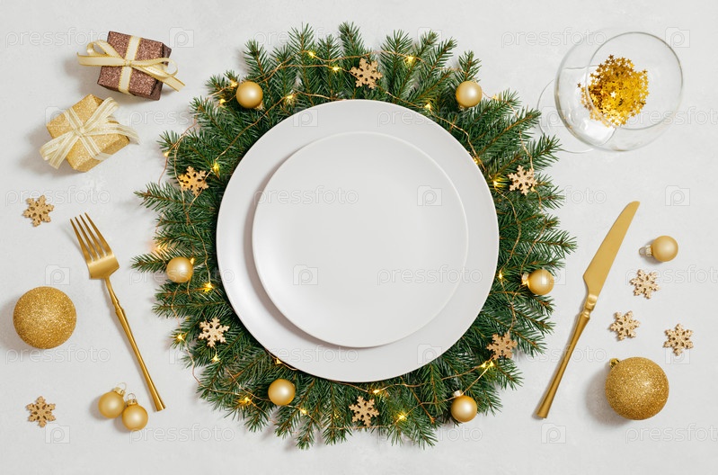 Рождественская сервировка с пустой тарелкой и золотыми украшениями на белом фоне. Новогодняя вечеринка. Праздничная сервировка стола на новый год. Вид сверху