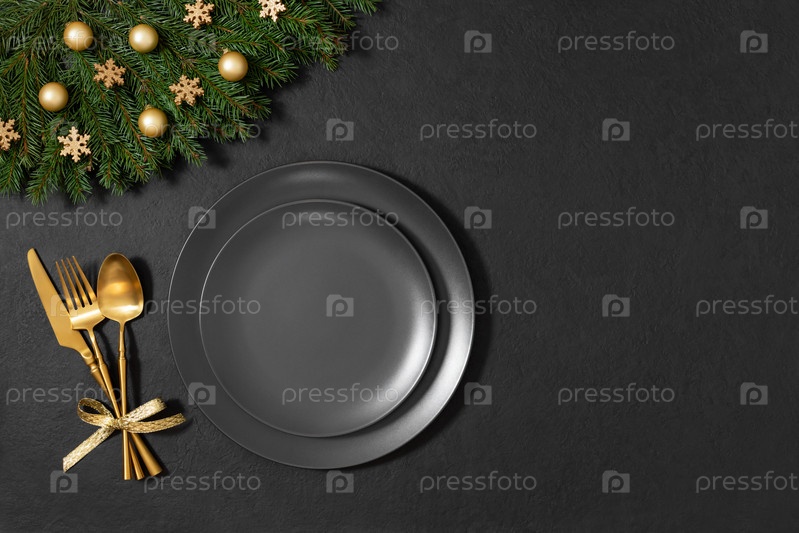 Пустая черная тарелка с золотыми столовыми приборами, праздничным декором и еловыми ветками на черном фоне. Рождественский или новогодний ужин. Место для текста. Вид сверху, плоская планировка