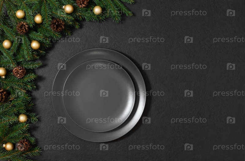 Черная пустая тарелка с еловыми ветками и праздничными украшениями на черном фоне с местом для копирования. Рождественская сервировка стола. Вид сверху