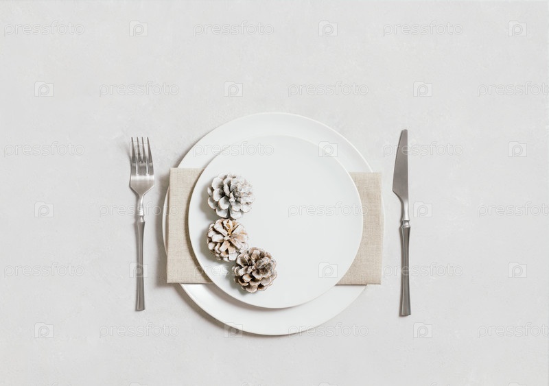 Сервировка стола с серебряными приборами, салфеткой, шишками и белой тарелкой на белом фоне. Рождественский или новогодний ужин. Копировать пространство. Вид сверху, плоская планировка