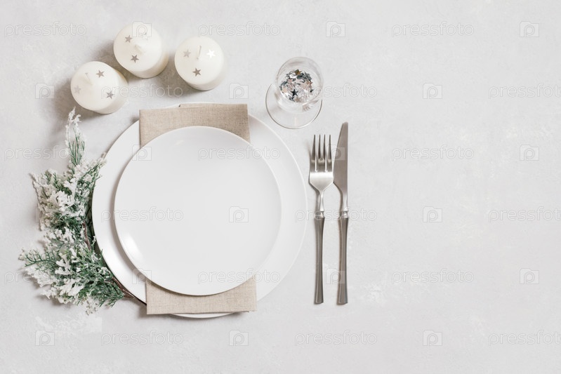 Рождественская сервировка с пустой белой тарелкой, свечами и столовыми приборами на белом фоне. Красивая новогодняя сервировка стола с копировальным пространством. Вид сверху, плоская планировка