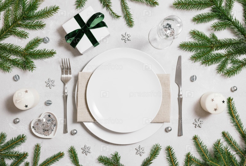 Красивая рождественская сервировка стола с серебряными столовыми приборами и украшениями, еловыми ветками и свечами. Пустая белая тарелка для новогодней сервировки. Вид сверху, плоская планировка. Копировать пространство. Шаблон для меню или дизайна