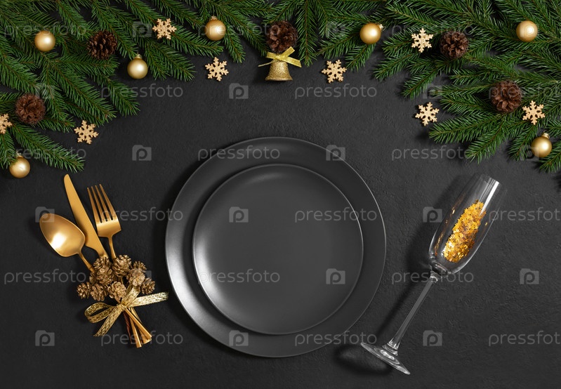 Черная сервировка стола с пустой тарелкой, золотыми столовыми приборами, праздничными аксессуарами и еловыми ветками для рождественского ужина. Вид сверху, плоская планировка. Копировать пространство