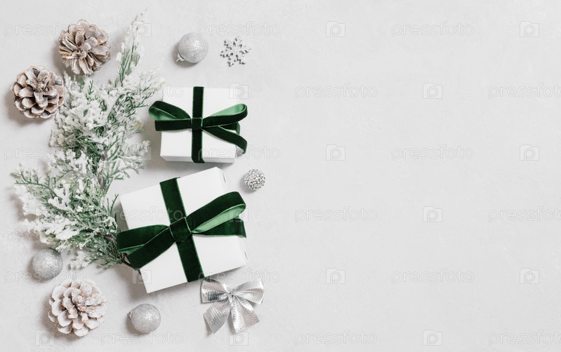 Рождественская рамка с подарками, еловой веткой и шишками на сером фоне. Подарки с серебряным декором и зелеными бантами. Копировать пространство. Вид сверху, плоская планировка