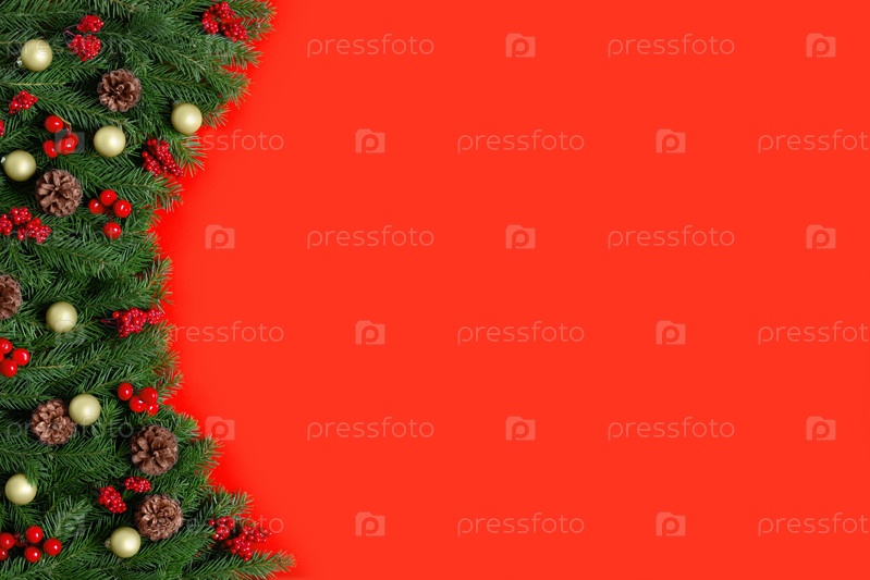 Рождественская рамка с еловыми ветками, шишками и праздничными украшениями на красном фоне с местом для копирования. Вид сверху