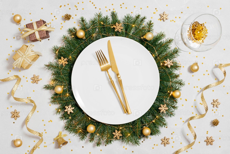 Рождественская золотая сервировка стола с золотыми украшениями и столовыми приборами на белом фоне. Красивая новогодняя сервировка. Вид сверху