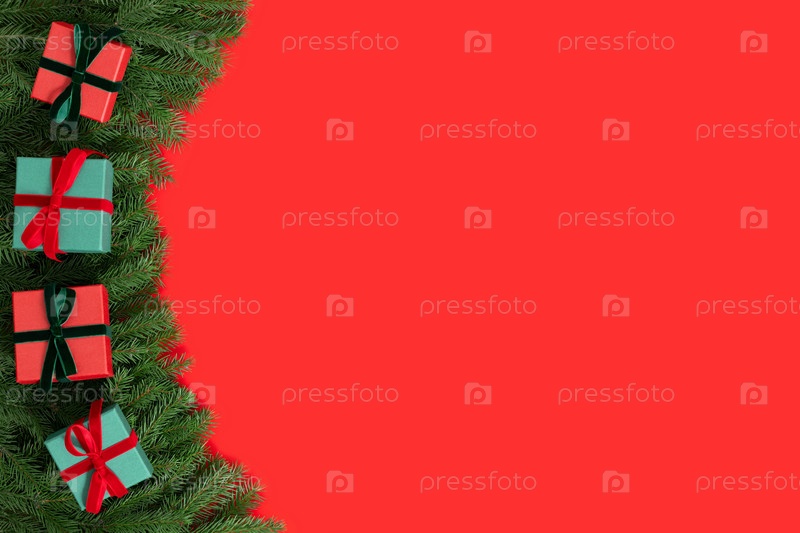 Рождественская рамка с еловыми ветками и подарочными коробками на красном фоне с местом для копирования. Рождественская или новогодняя открытка. Вид сверху