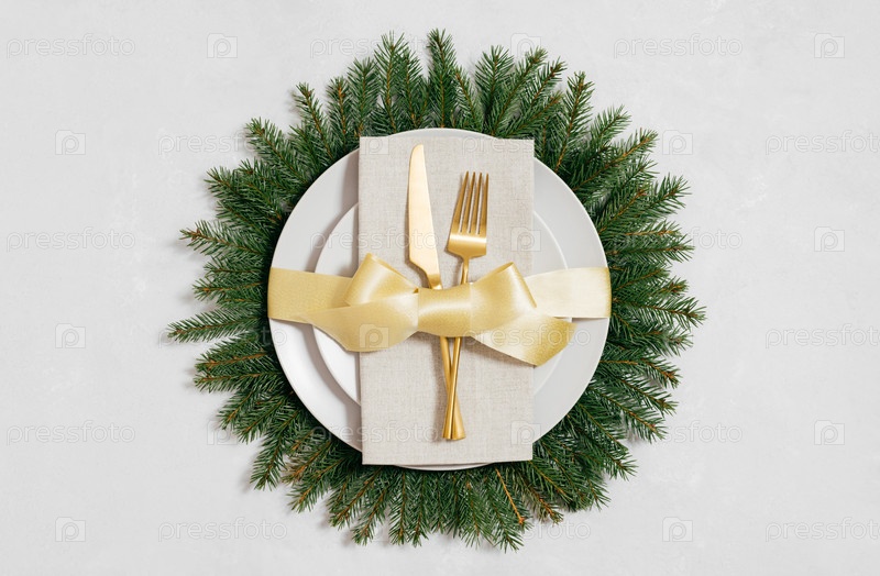 Тарелка с золотыми столовыми приборами и бантами в рождественском венке на белом фоне. Сервировка новогоднего стола. Вид сверху, плоская планировка