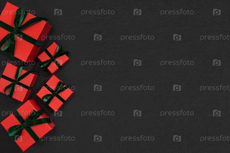 Рождественская рамка с красными упакованными подарками на черном фоне. Новогодняя открытка. Вид сверху. Место для текста