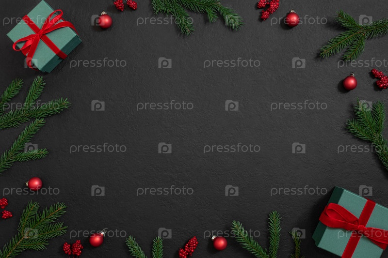 Рождественский фон с подарками, еловыми ветками и праздничным декором с местом для копирования. Новогодняя открытка. Вид сверху. Шаблон, макет