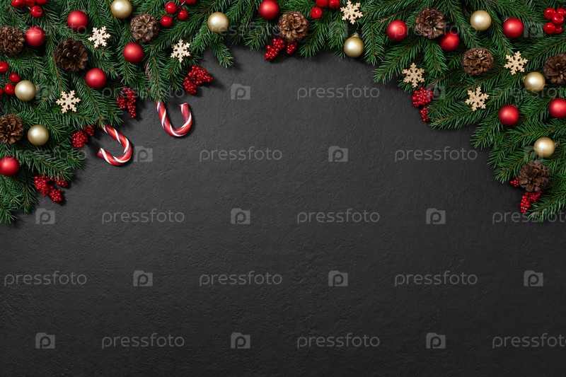 Рождественская рамка с еловыми ветками, леденцом и праздничными украшениями на черном фоне с местом для копирования. Зимний праздник. Рождественская поздравительная открытка