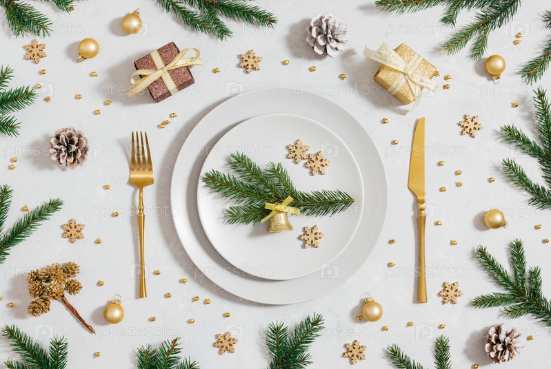 Рождественская золотая сервировка стола с праздничными золотыми аксессуарами и столовыми приборами на белом фоне. Красивая новогодняя сервировка. Прямо сверху. Плоская планировка
