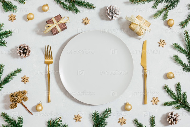 Красивая рождественская сервировка стола с золотыми столовыми приборами и украшениями, еловыми ветками и подарками. Пустая бежевая тарелка для новогодней сервировки. Вид сверху