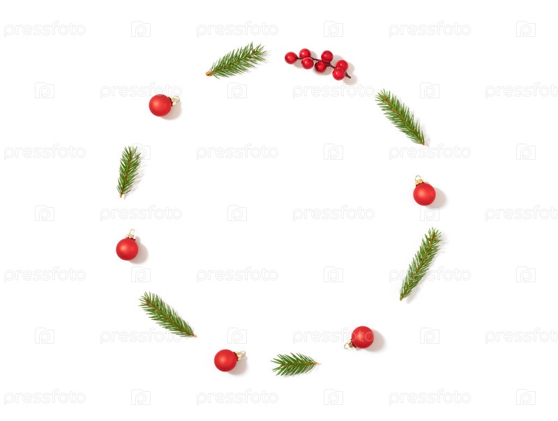 Рождественская круглая рамка с еловыми ветками и красными безделушками, изолированными на белом фоне. Новогодний венок. Копировать пространство, шаблон. Вид сверху, плоская планировка