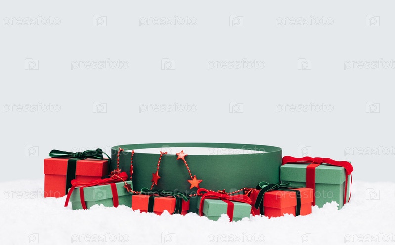 Пустая зеленая круглая подарочная коробка в снегу изолирована на синем фоне. Рождественский фон для дизайна. Шаблон, макет. Место для текста