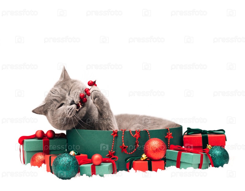 Британский кот в подарочной коробке кусает праздничное украшение, изолированное на белом фоне. Рождественский кот с подарочными коробками в зимнем снегу. Новогодняя поздравительная открытка. Копировать пространство