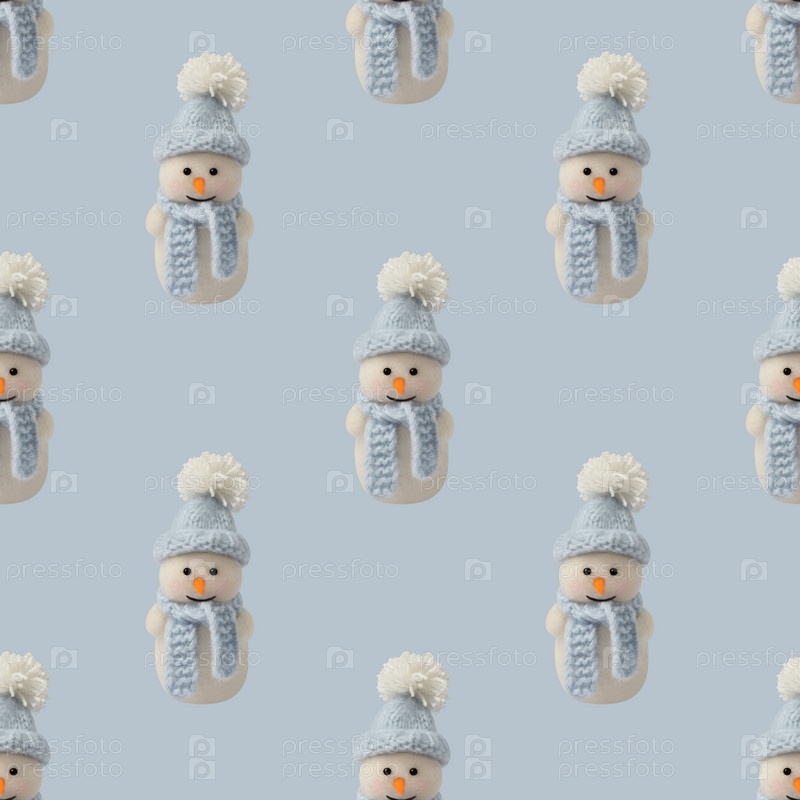 Бесшовный узор со счастливым игрушечным снеговиком на синем фоне. Рождественские украшения. С Новым годом