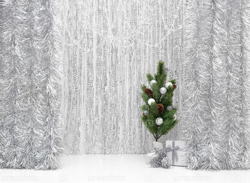 Пустая столешница с рождественской елкой на блестящем серебряном фоне. Новогодняя открытка с местом для копирования