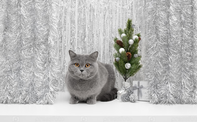 Британский милый кот с рождественской елкой на серебряном праздничном фоне. Новогодняя открытка с котом и рождественскими украшениями