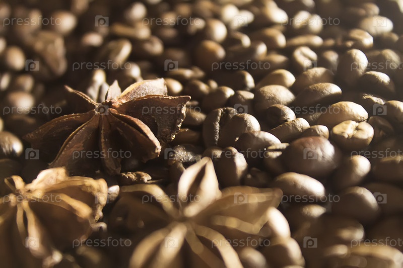Звездчатый анис на жареных кофейных зернах, крупный план