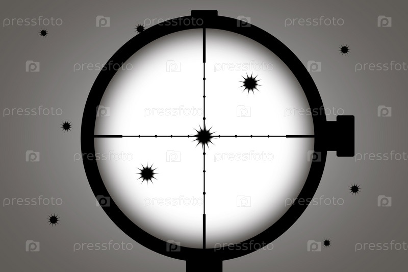 Отверстия от пуль на белой стене, вид через оптический прицел винтовки
