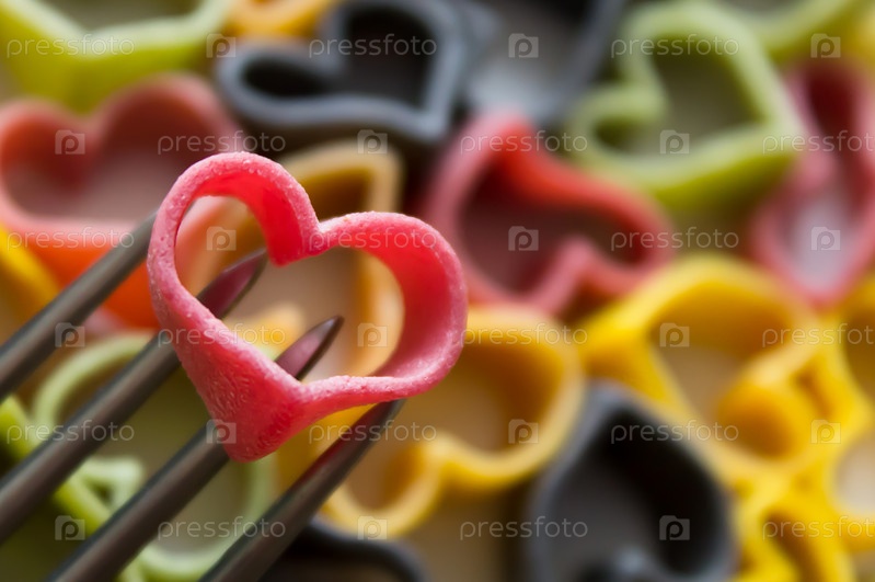 Красная паста в форме сердца на вилке, перед приготовлением
