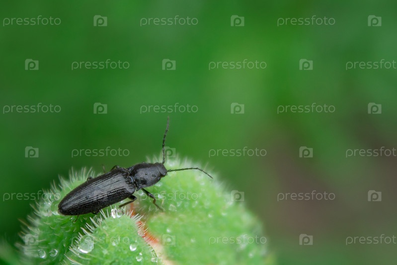 Капли дождя на маковом бутоне, на котором сидит жук, крупный план