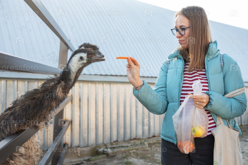 Женщина в синей куртке кормит любопытного эму морковкой на животноводческой ферме, создавая веселое и запоминающееся общение