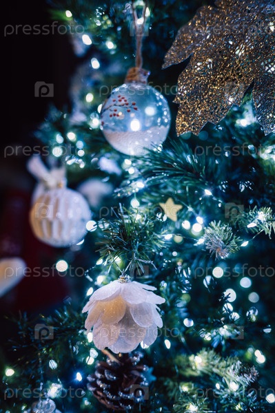 Рождественская ель, украшенная шарами, крупным планом