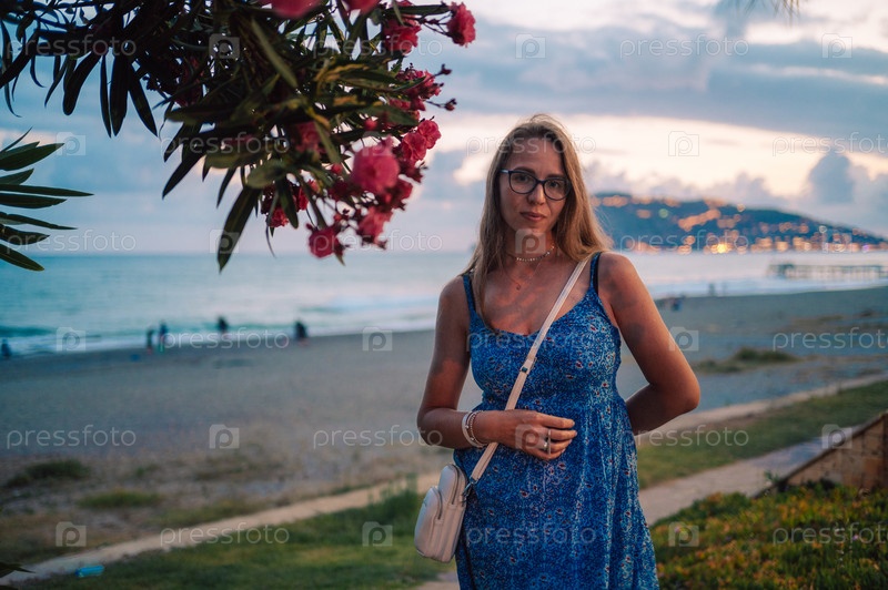 Женщина сидит на пляже и смотрит на море в городе Аланья