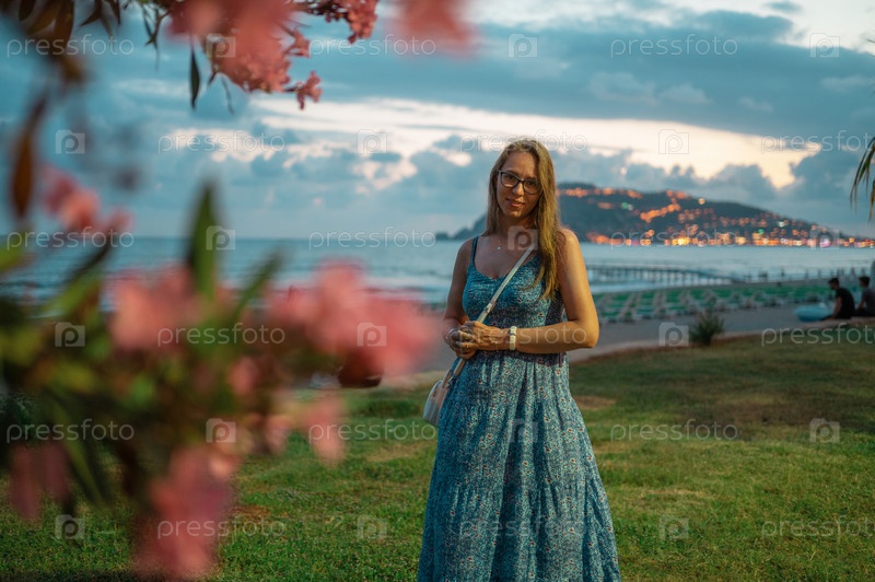 Женщина сидит на пляже и смотрит на море в городе Аланья