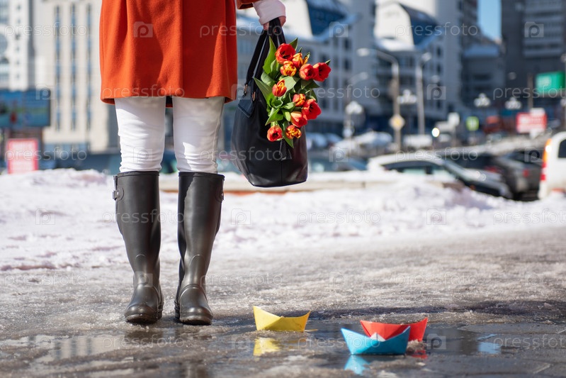 Крупный план женщины в оранжевом пальто и резиновых сапогах, идущей по улице с букетом тюльпанов