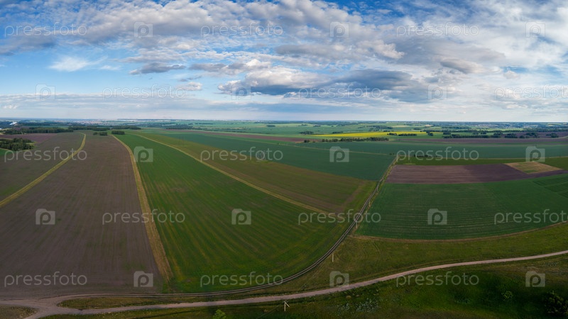 Вид с воздуха на обширные сельскохозяйственные угодья под облачным небом