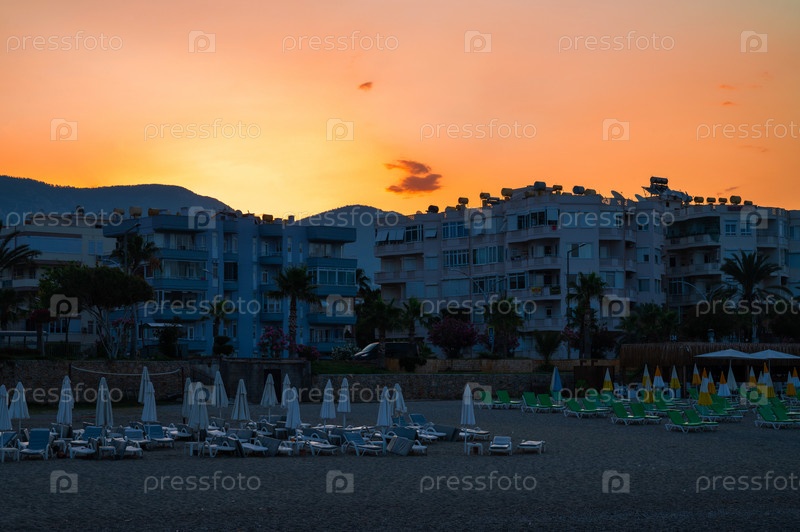 Береговая линия турецкого пляжа в городе Аланья на рассвете рано утром. Концепция путешествия или отпуска