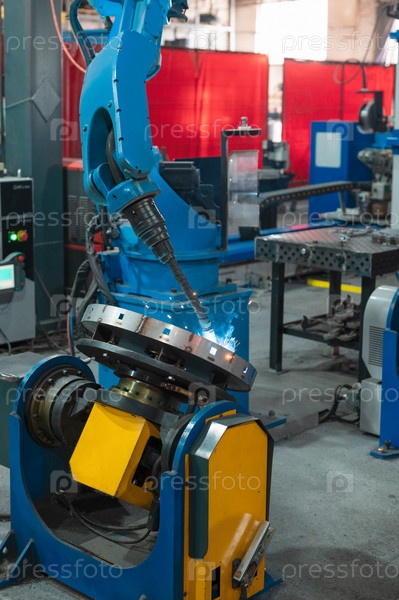 Автоматический промышленный сварочный робот на современном заводе в эксплуатации