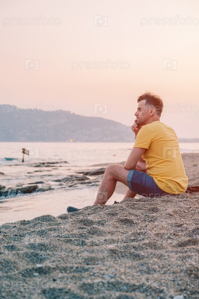 Мужчина сидит на пляже и смотрит на море в городе Аланья