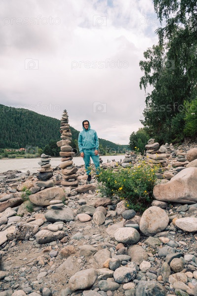 Мужчина у реки Катунь в летний день. Поездка в Алтайские горы в Республике Алтай