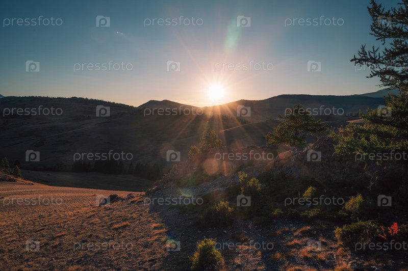 Захватывающий закат над суровым горным ландшафтом, отбрасывающий теплый золотистый свет на холмы, деревья и скалистую местность. Алтайские горы