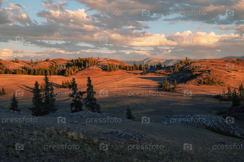 Захватывающий закат над суровым горным ландшафтом, отбрасывающий теплый золотистый свет на холмы, деревья и скалистую местность. Алтайские горы