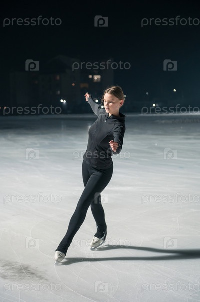 Молодая женщина в черном спортивном костюме грациозно катается на коньках на освещенном открытом катке ночью, окруженная мягким светом