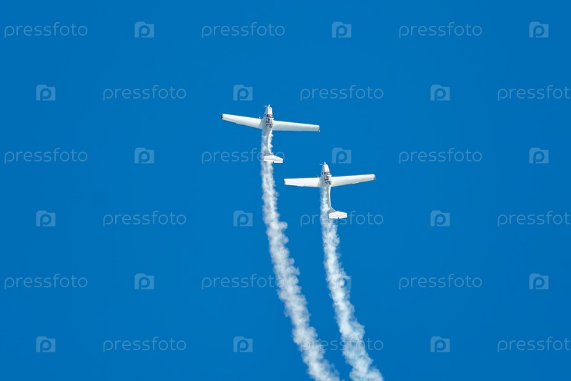 Самолет-пилотажник, выполняющий трюки в голубом небе с дымовым следом. Концепция командной работы, сотрудничества, координации, доверия, точности, сложности, вызова, скорости, синергии