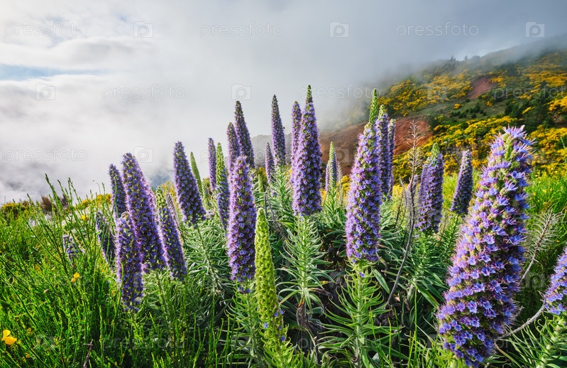 Пейзаж Мадейры с цветами Pride of Madeira и цветущими кустарниками Cytisus и горами в облаках Мирадурос-ду-Паредау, остров Мадейра, Португалия