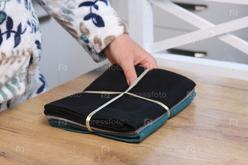 Женщина распаковывает и рассматривает набор кухонных полотенец. Три полотенца разных цветов лежат на столе, перевязанные веревкой. Крупный план