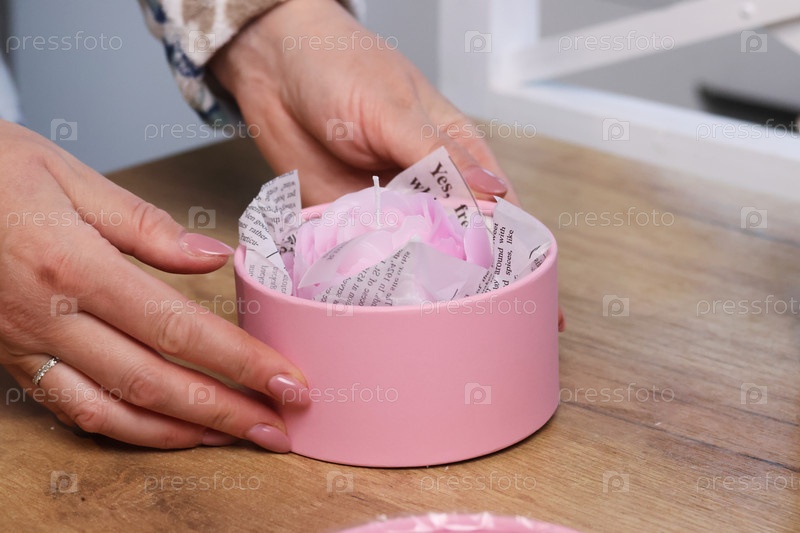 Женщина упаковывает свечу в форме цветка в подарочную коробку