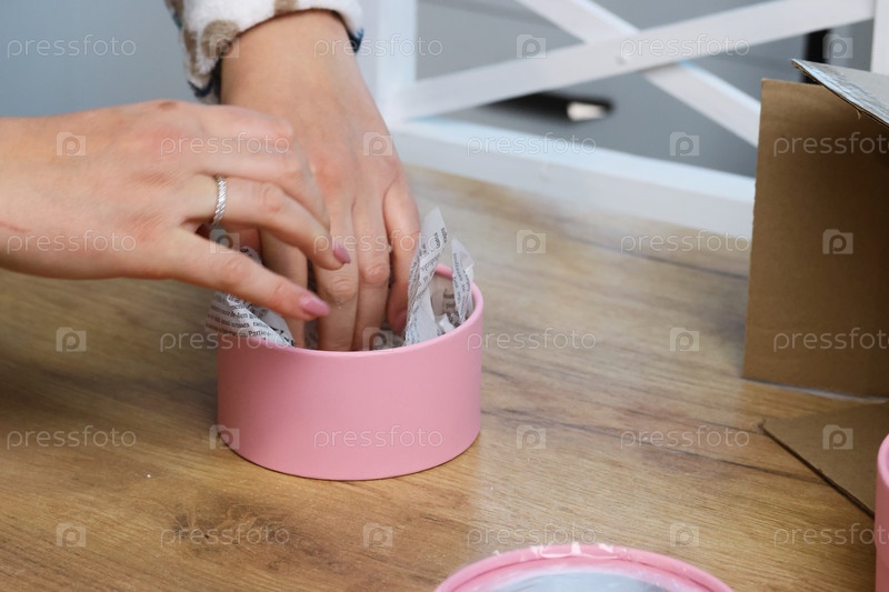 Женщина работает с подарочной упаковкой. Маленькая розовая коробка с окошком в крышке