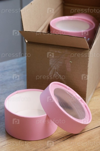 Картонная коробка с набором розовых подарочных коробок. Маленькие коробки с окошками. Подарочная упаковка. Крупный план